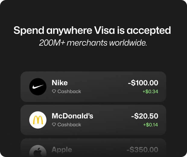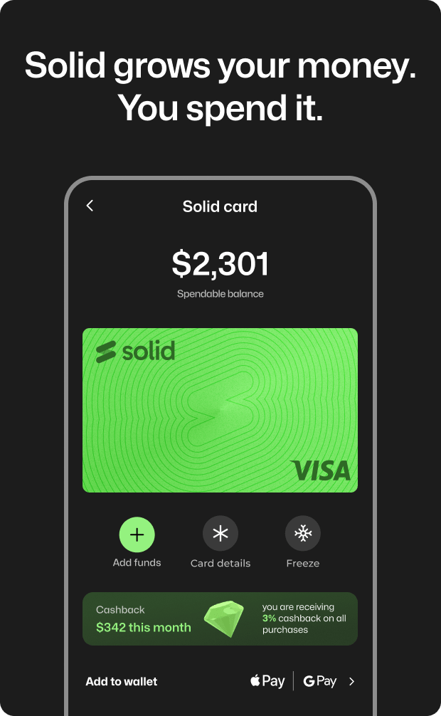 Solid puts your funds to work in the background. Your balance grows and you can spend directly from it at any time. - 🌍 Spend Anywhere – accepted by 200M+ merchants worldwide. Use your Solid Visa card at Starbucks, Uber, Airbnb, McDonald’s, and millions more, with Apple Pay or Google Pay support from day one.