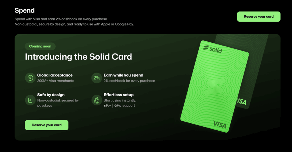 Early access is already open: users can pre-order directly through the Solid app to secure their spot. Pre-ordering ensures priority placement, with notifications sent as soon as the card goes live.